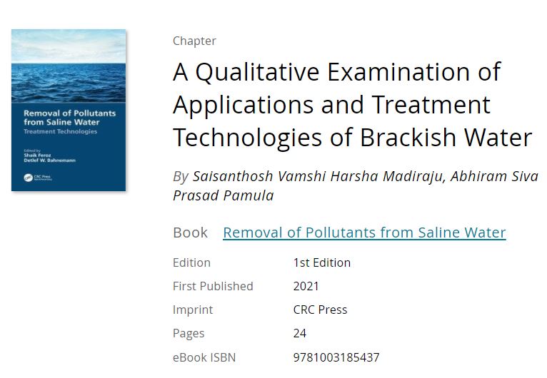 Saisantosh Vamshi Harsha Madiraju, Abhiram Pamula, “A Qualitative Examination of Applications and Treatment Technologies of Brackish water”, In Treatment Technologies for Saline Water Systems, CRC Press, Taylor & Francis Group (2021)