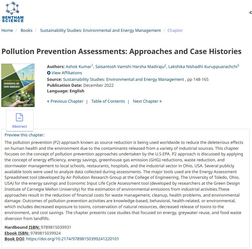 Kumar, Ashok.,*; Madiraju, SVH; and Kuruppuarachchi, Lakshika, “Pollution Prevention Assessments: Approaches and Case Histories”, In Sustainability Studies: Environmental and Energy Management, Bentham Publication, (2022) https://doi.org/10.2174/97898150399241220101).