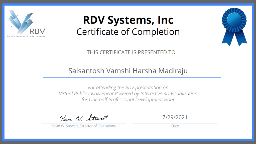 0.5 Professional Development Hour for RDV presentation on Virtual Public Involvement Powered by Interactive 3D Visualization