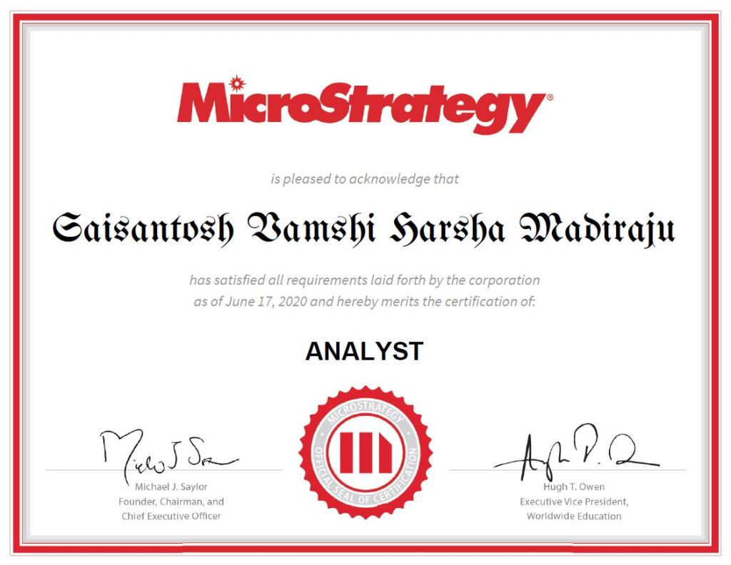 Completed analyst certification in MicroStrategy