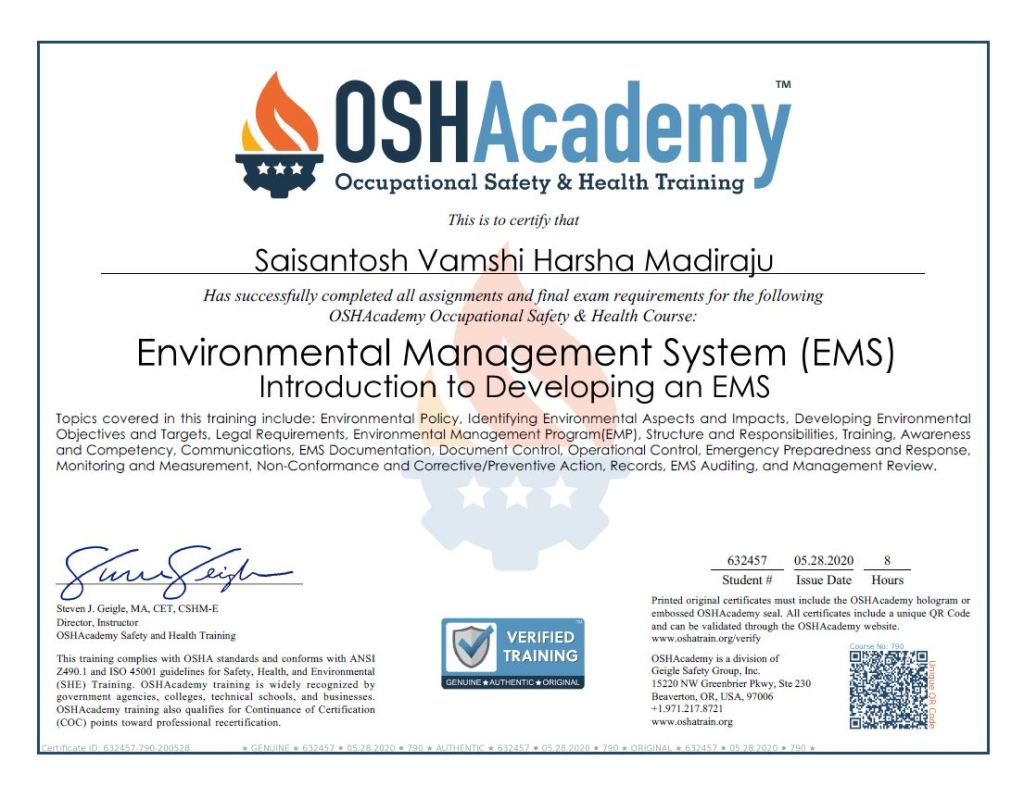 Completed 8hrs of EMS Introductory training at OSHAcademy under the Occupational Safety and Health Training program.